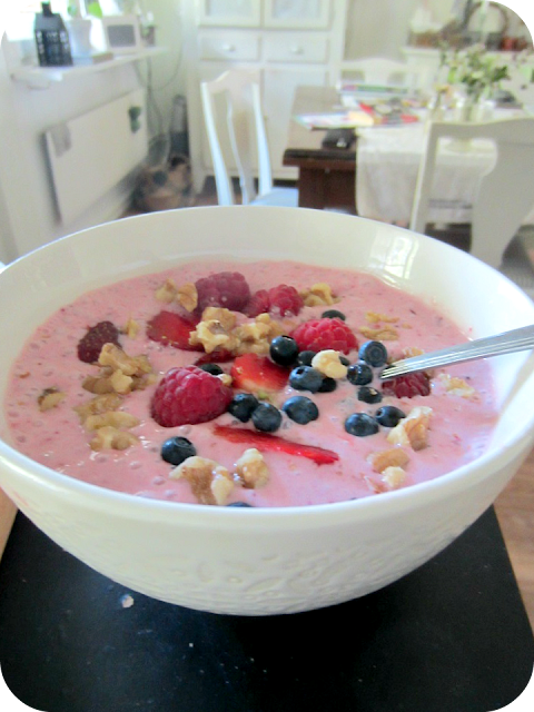 Jag köper jordgubbar, hallon (mina gav ingenting i år), plockar blåbär i skogen, samt en banan för lite extra sötma. Mixar ner det i naturell yoghurt, samt sparar några hela bär för toppingen.